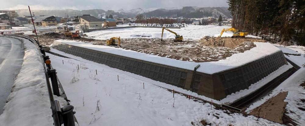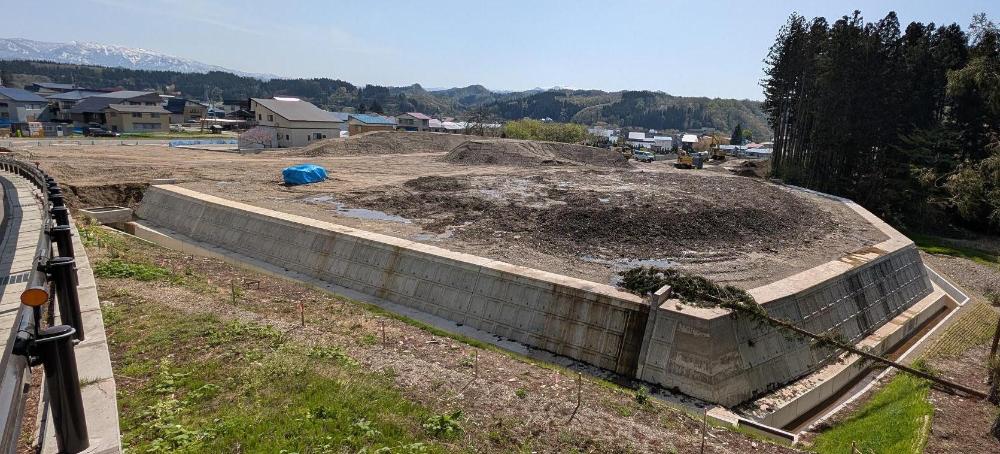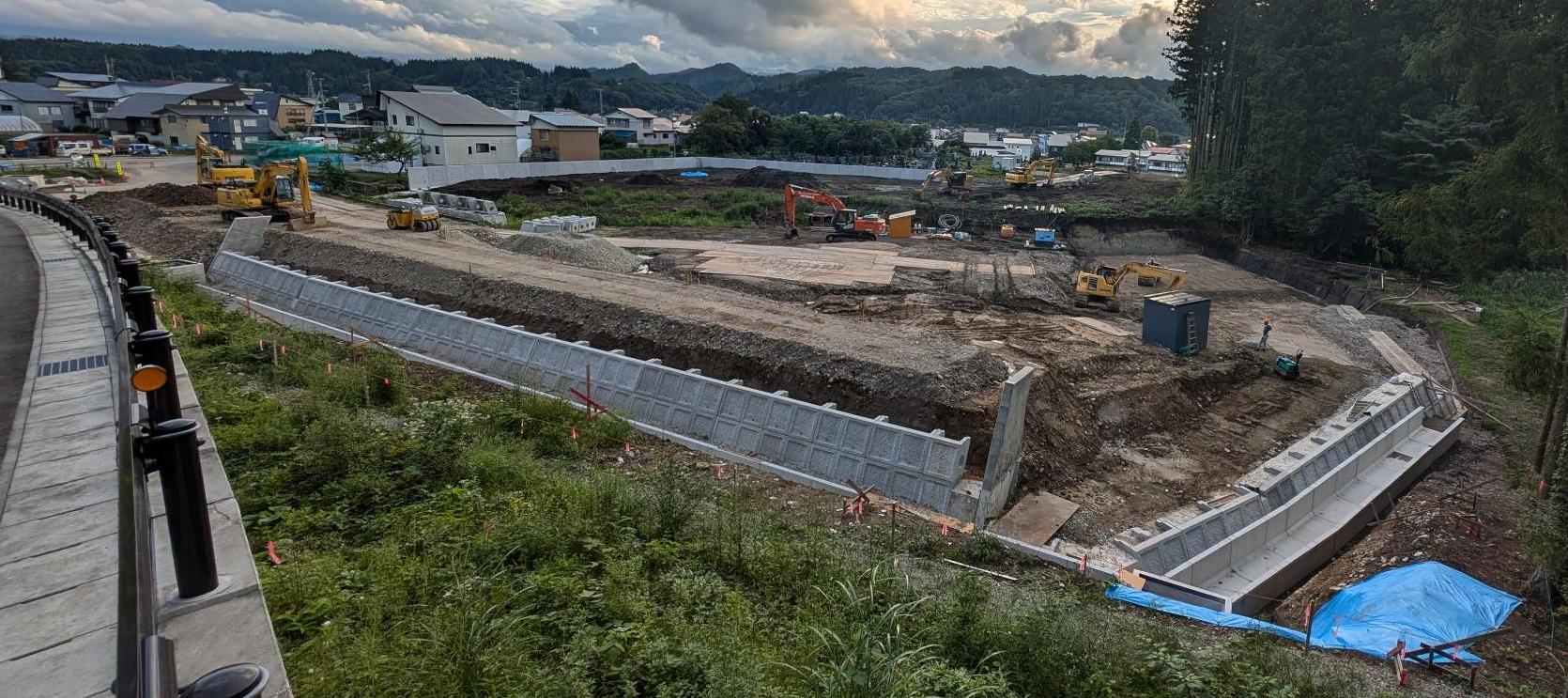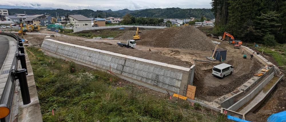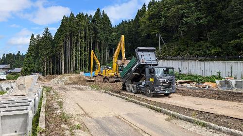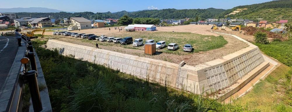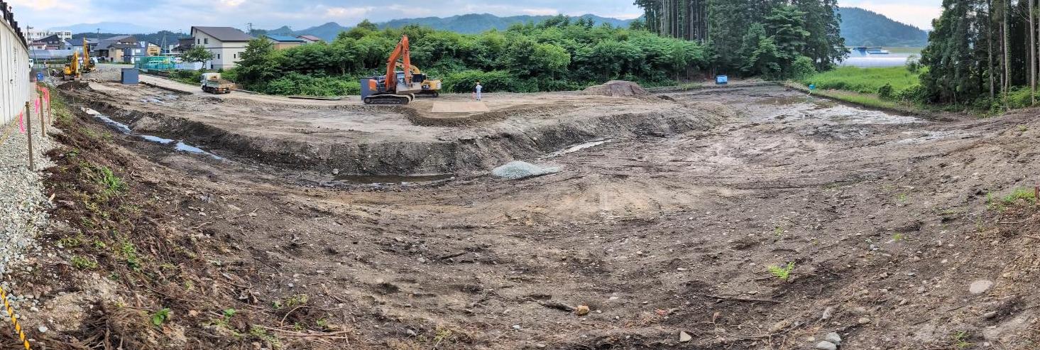安全祈願祭を執り行った、令和7年7月30日の状況です。ブロック積擁壁工の一部を残し、敷地内の盛土と整地が完成しました。
